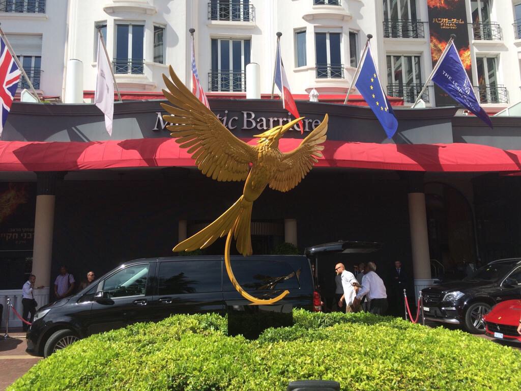 O Festival de Cannes, diferentemente do Oscar, vem a cada ano se enturmando com as sagas que tomam conta do cenário cinematográfico. Foi divulgado um cartaz com Katniss e sua irmã, Prim com uma expressão que diz tudo (Você confere abaixo). Uma tordo gigante também fora fixado como prelúdio para a estreia em Novembro (Veja a imagem logo depois do cartaz)