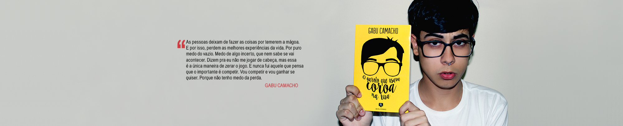 Sobre o autor: Gabu Camacho é blogueiro, escritor e fotógrafo. Nasceu em 1996, em São José dos Campos, no interior de São Paulo, lê e escreve desde os quatro anos, quando aprendeu a inventar pequenas histórias esperando o próximo volume de Harry Potter. Estudante de Jornalismo, criou o Beco Literário em 2012, site sobre o universo jovem, que agora acumula leitores em todo o Brasil, das mais variadas idades. No tempo livre, grava vídeos aleatórios para o Youtube e sofre esperando a próxima visita do carteiro. @