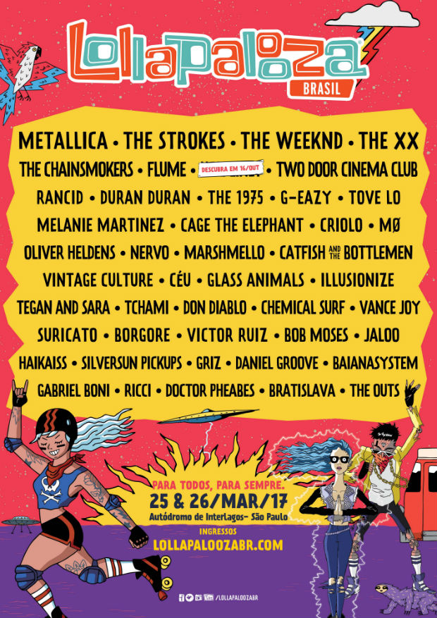 Após muita expectativa, o line-up do Festival Lollapalloza 2017 foi divulgado na manhã desta quarta-feira pelos organizadores. Os destaques são as bandas Metallica, The Strokes, The xx, e os artistas sensação do momento: The Weeknd e G-Eazy. Confira todos abaixo: