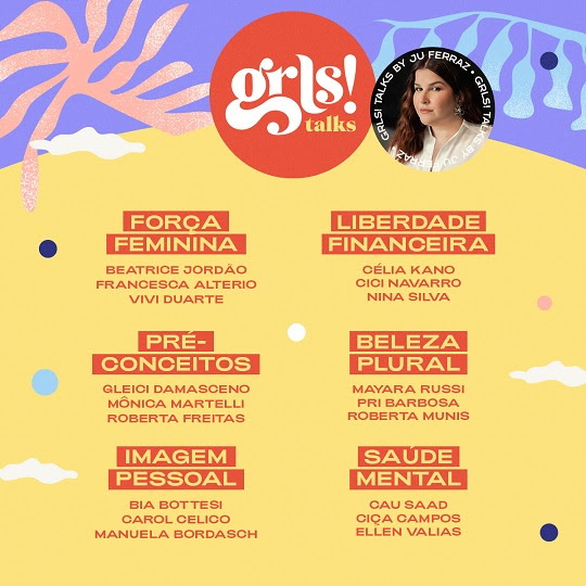 Para falar sobre “Liberdade Financeira”, a mediadora Ju Ferraz recebe Nina Silva (considerada a “Mulher Mais Disruptiva do Mundo”, pela Women in Tech Global Awards 2021), Célia Kano (co-CEO da Rede Mulher Empreendedora e diretora do Instituto Rede Mulher Empreendedora) e Cici Navarro. A atriz e apresentadora carioca Mônica Martelli marca presença no painel “Pré-Conceitos“, ao lado das ex-BBBs Roberta Freitas e Gleici Damasceno – à convite de Buscofem, apoiador do festival; enquanto Ellen Valias (fundadora do Rachão Basquete Feminino e comentarista dos jogos da NBA), encerra a programação de Talks com o debate sobre “Saúde Mental”, ao lado de Cau Saad (formada em Educação Física e especializada em nutrição esportiva) e Ciça Campos (fundadora da ILKA, clínica digital de saúde feminina). Todos os Talks serão captados no próximo dia 28 de fevereiro, terça-feira, e o público do festival poderá acompanhar os bastidores exclusivos (além de alguns spoilers dos papos), pelo Instagram do GRLS! (@festivalgrls).