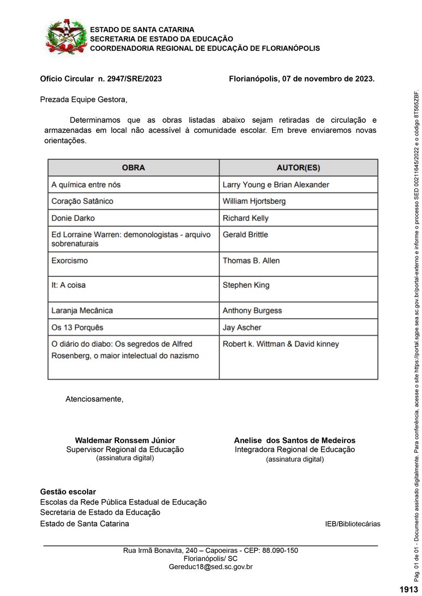 A Secretaria de Educação de Santa Catarina determinou às bibliotecas escolares na última terça (7) que nove livros fossem retirados de escolas de Florianópolis e fossem armazenados em “local não acessível à comunidade escolar”. O ofício ainda dizia que em breve chegariam novas orientações.