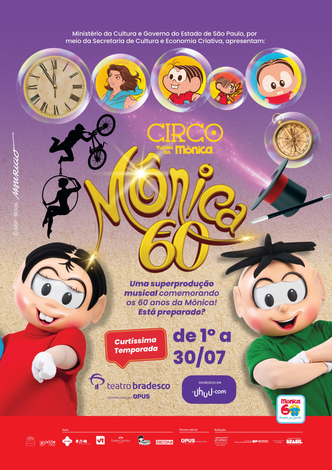 Circo Turma da Mônica – Mônica 60 é apresentado pelo Ministério da Cultura e Governo do Estado de São Paulo, e conta com apoio de Besni, Livelo, Eaton, VR, Faber-Castell e Panco. Produzido nos estúdios da Mauricio de Sousa Produções, o espetáculo conta com a parceria cultural de OPUS Entretenimento e estreará no Teatro Bradesco, em 1º de julho. Os ingressos já estão disponíveis no site da Uhuu.com e bilheteria física da casa, localizada no Bourbon Shopping. A partir de 12 de agosto, será a vez do Rio de Janeiro receber a atração. Mais informações sobre a temporada carioca serão divulgadas em breve.