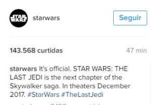 O novo título do oitavo episódio de Star Wars acaba de ser revelado! Com previsão de estreia para 15 de dezembro de 2017, os fãs da aclamada saga irão testemunhas nas telonas o Star Wars: The Last Jedi, tradução livre para português de “Guerra nas Estrelas: O último Jedi”.