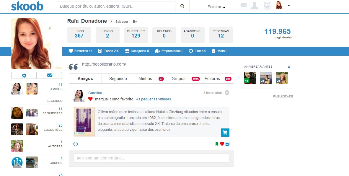 Mas Rafa, O que diabos é Skoob? De onde veio? O que come? Para onde vai? Calma amigo, eu te explico: o Skoob é uma rede social voltada para leitura. Lá, é possível criar seu perfil, catalogar todos os livros lidos, os que você quer ler, os seus favoritos, quais você emprestou, que livros você já releu, quais você abandonou e quais você gostaria de trocar. É possível ainda criar metas de leitura (que irão te notificar quando você tiver atrasado) para o ano inteiro!